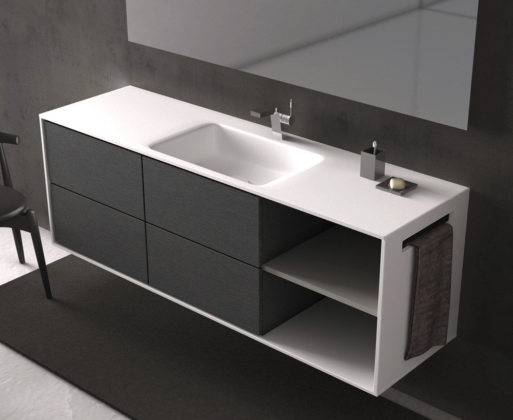 Mobiliario con estructura de porcelánico y estantes y cajones en madera.