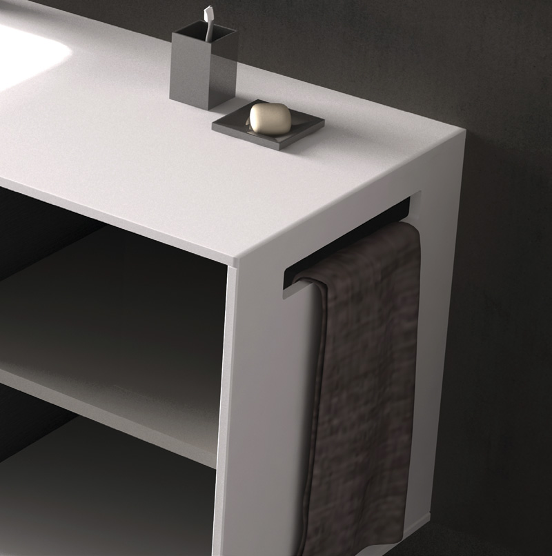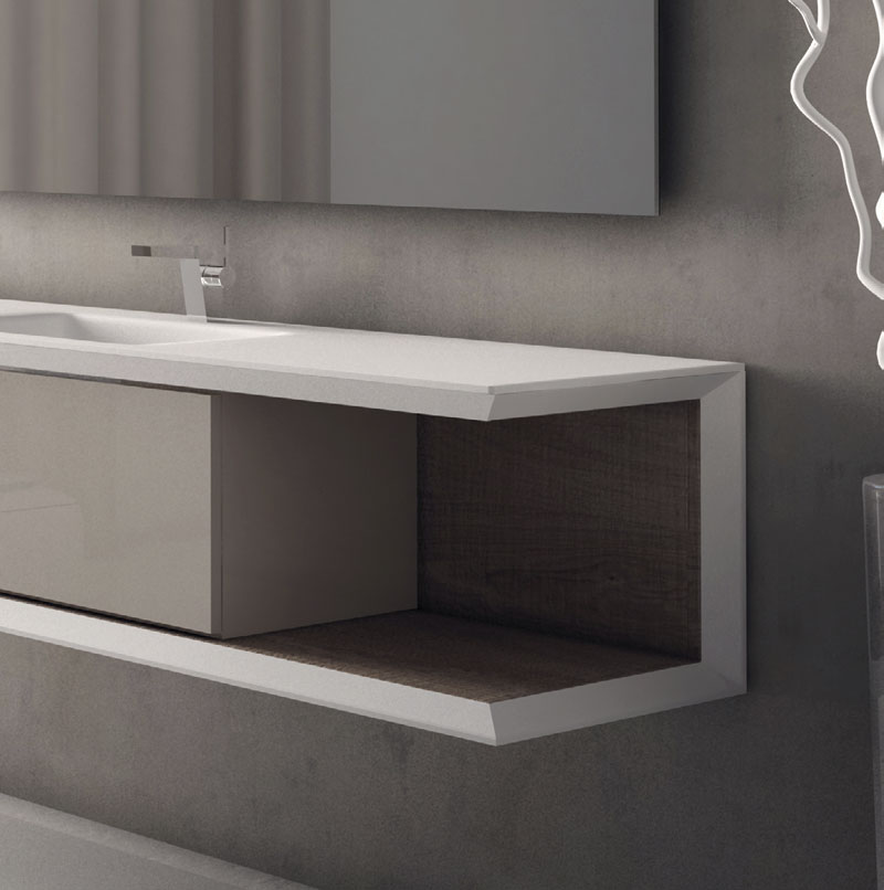 Mobiliario para baño de hotel con estructura de porcelánico volada y acabados en madera natural y lacado brillo.