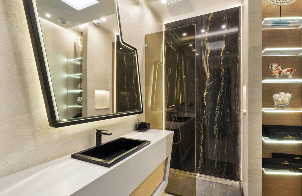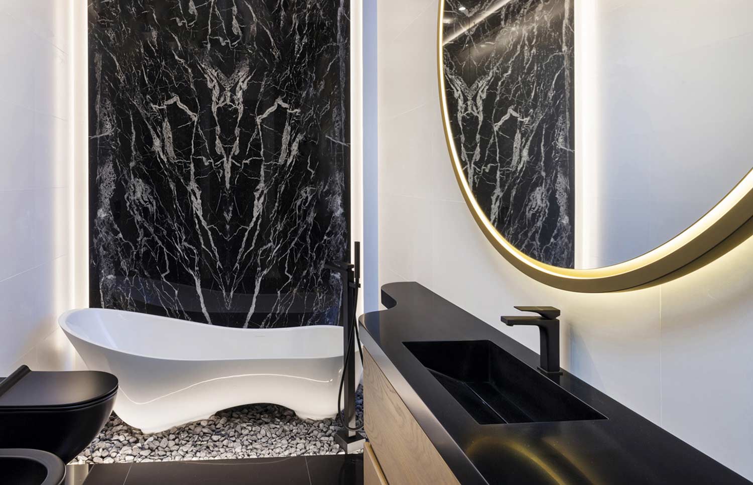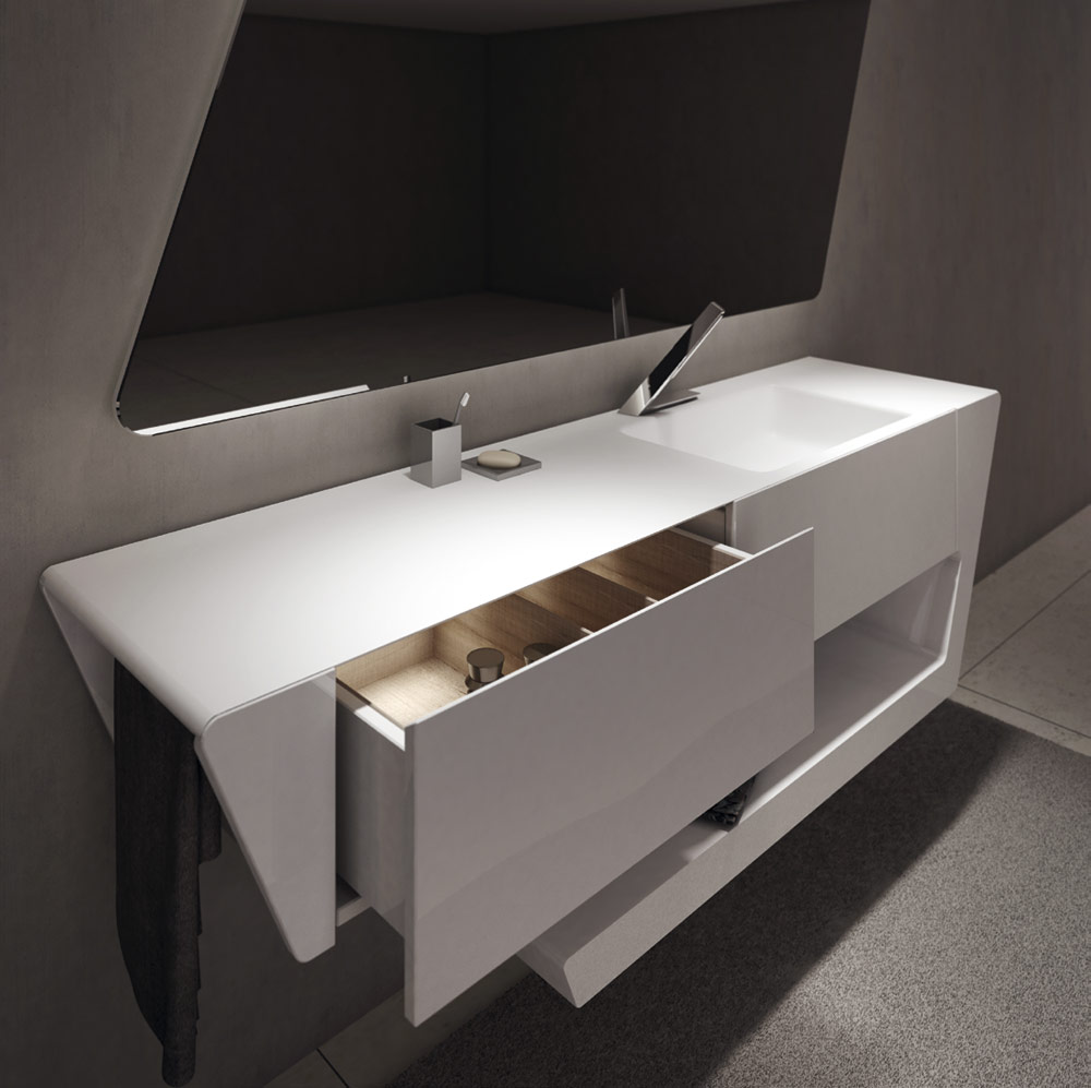 Mobiliario para baño de hotel con panelados retroiluminados y muebles de formas redondeadas acabado lacado brillo.