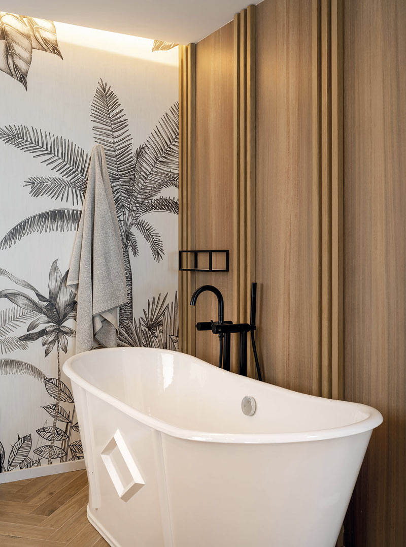 Mobiliario para baño de hotel con detalles de madera de diferntes texturas y acabados.