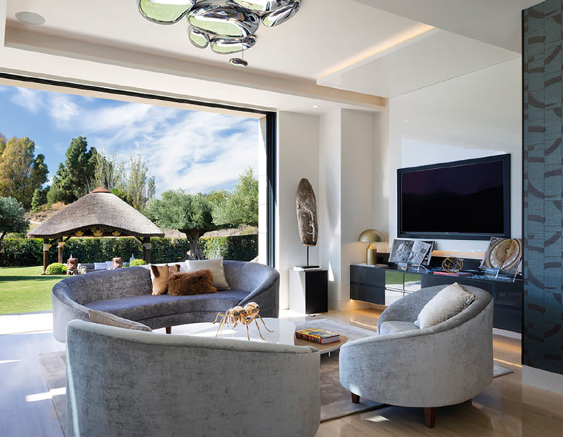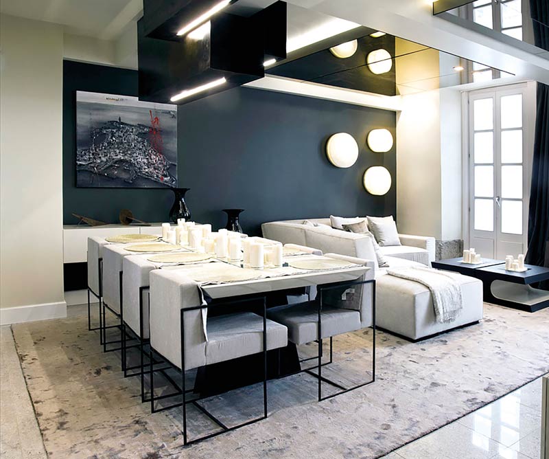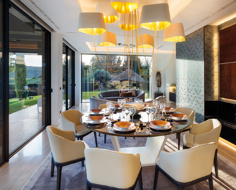 Mesa de comedor a medida en madera con sillas tapizadas y soportes metálicos a medida. Mesas de centro con formas redondeadas en madera y acabados metálicos efecto espejo.