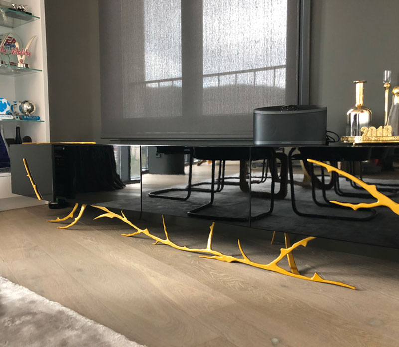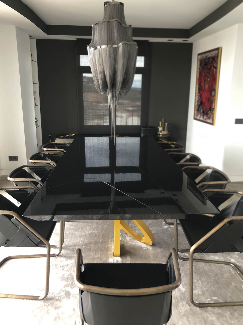 Mesa de comedor en lacado negro alto brillo con patas metálicas forjadas a medida y lacadas en tonos metalizados a juego con aparador y mesas auxiliares.