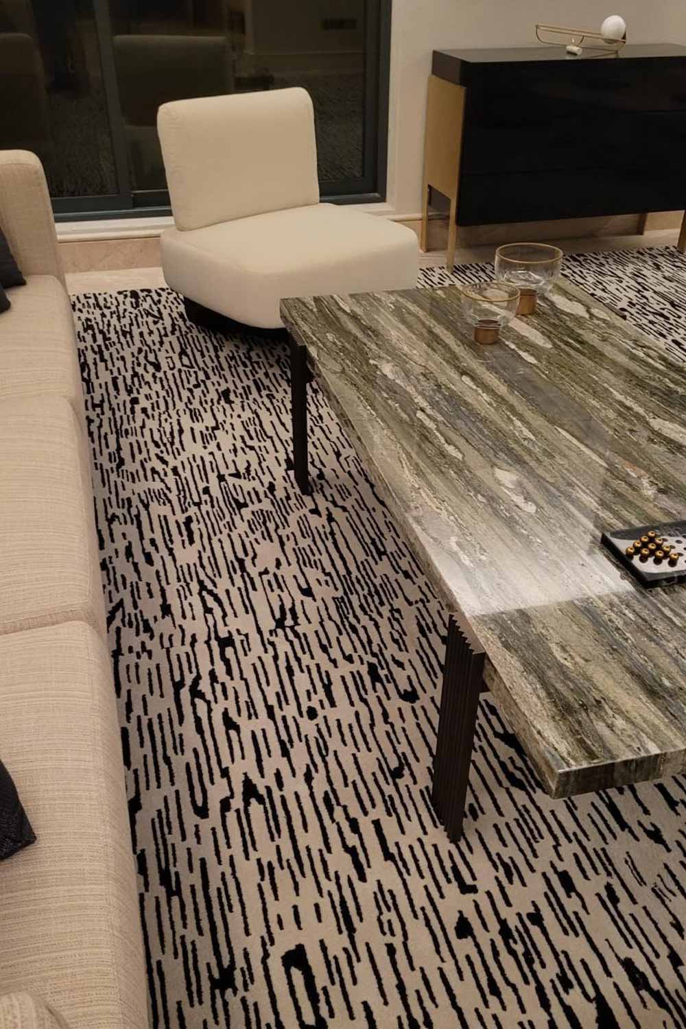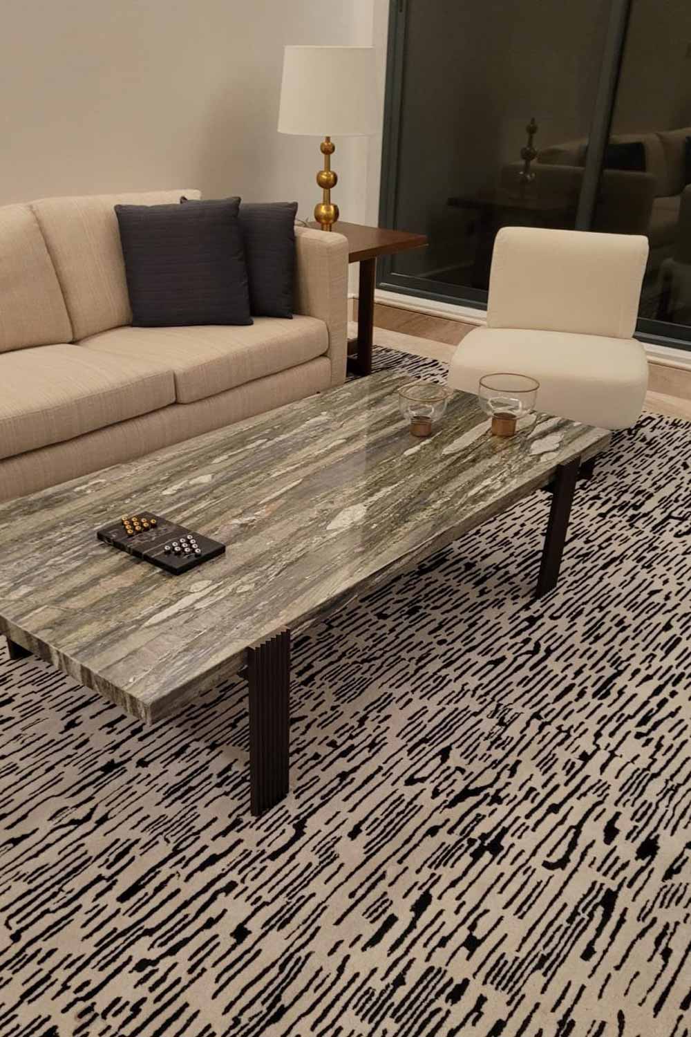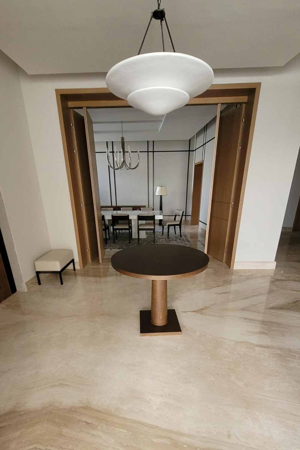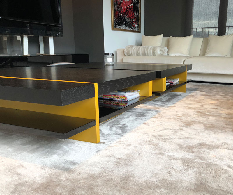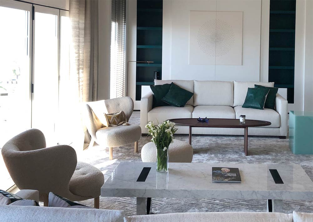 Desarrollo de mobiliario de salón con mesa de centro en mármol realizada a medida.