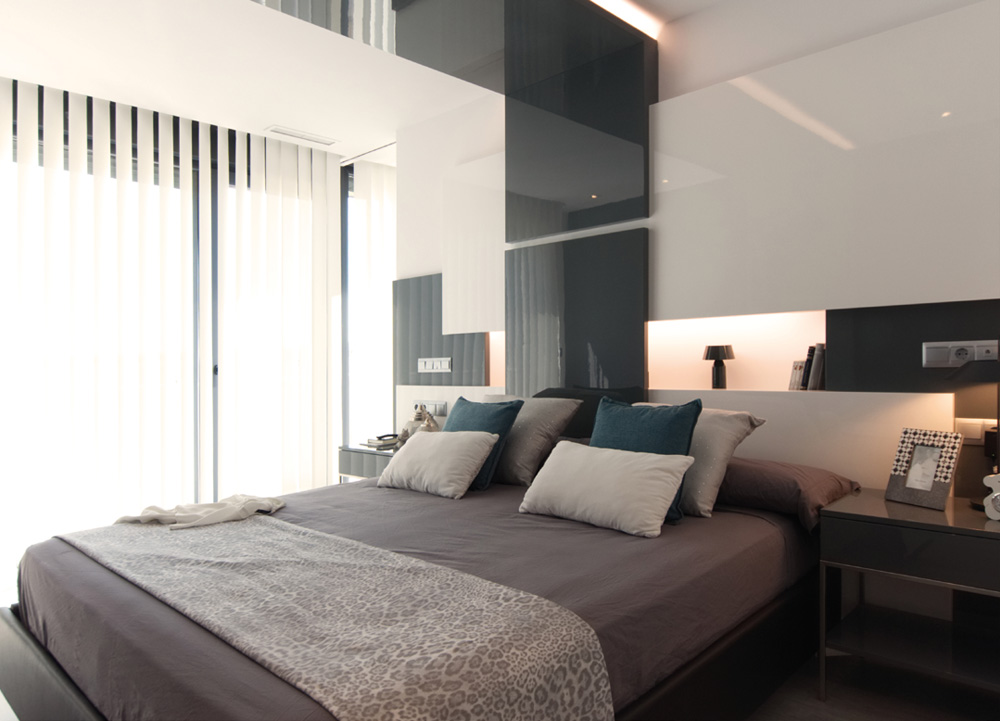Dormitorio de matrimonio con zona de cabecero panelada en laca brillo curvado y mesillas integradas. Estructura de la cama tapizada en terciopelo y luz led integrada.