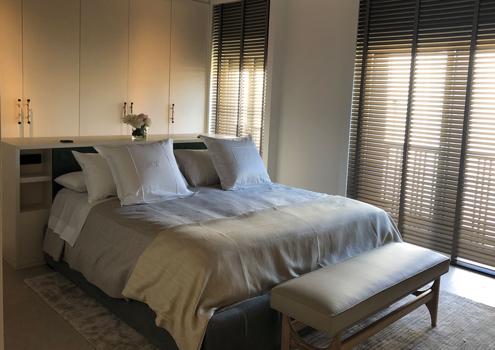 Dormitorio con mobiliario a medida y cama tapizada.