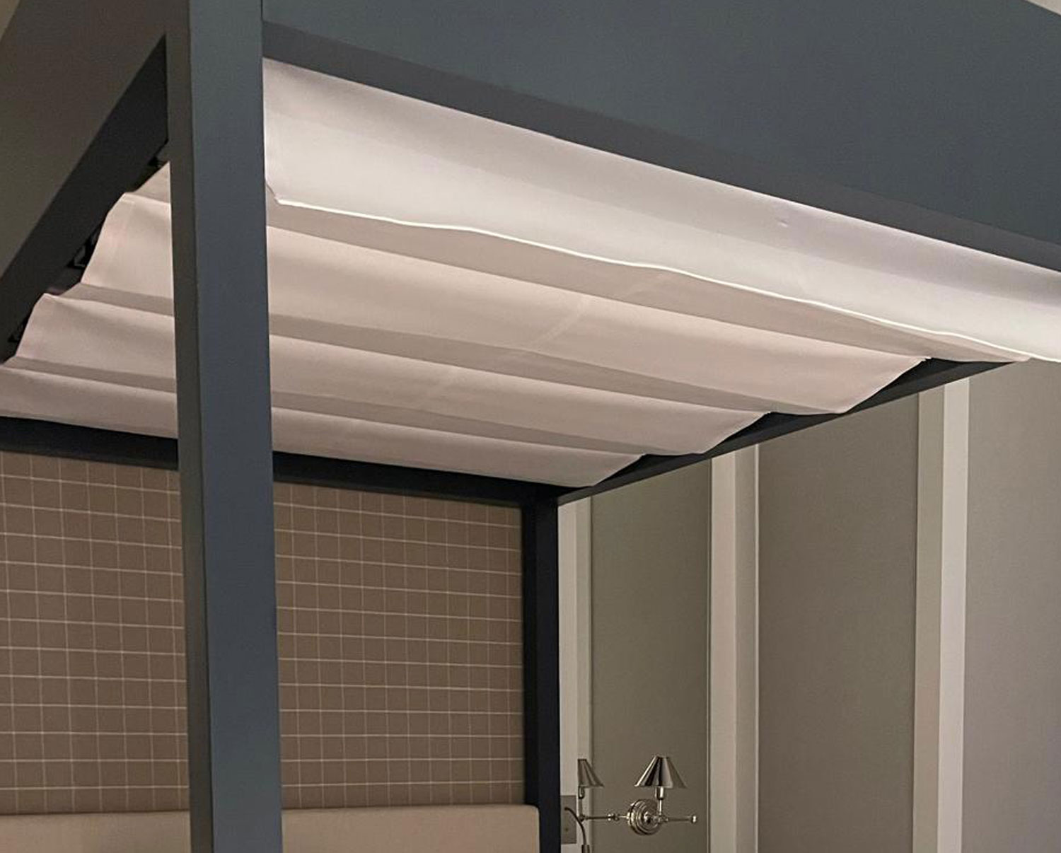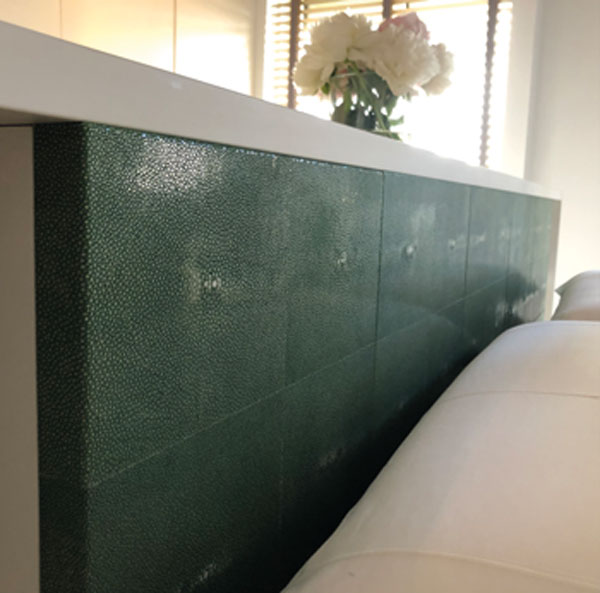 Detalle de cabecero a medida con estructura en laca mate, tapizado acolchado e iluminación integrada.
