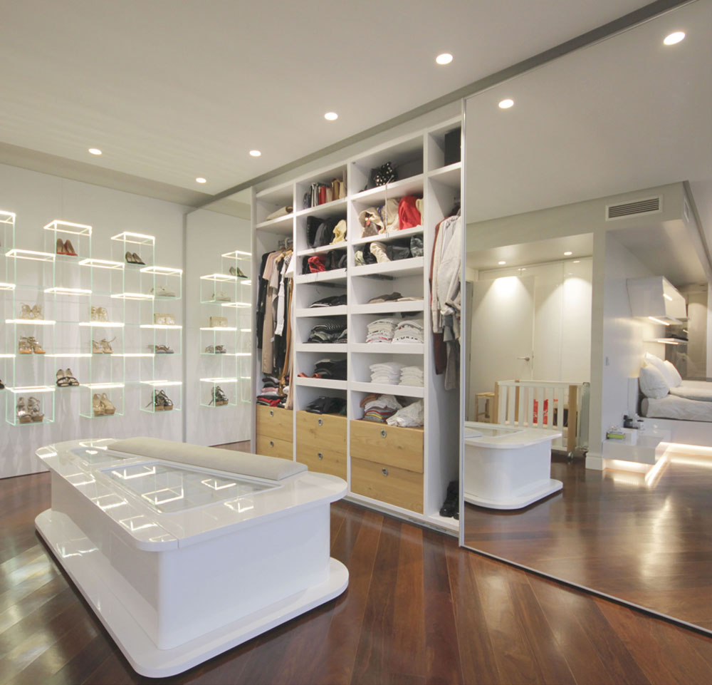 Vestidor con armario en espejo y estantes de metacrilato iluminados.