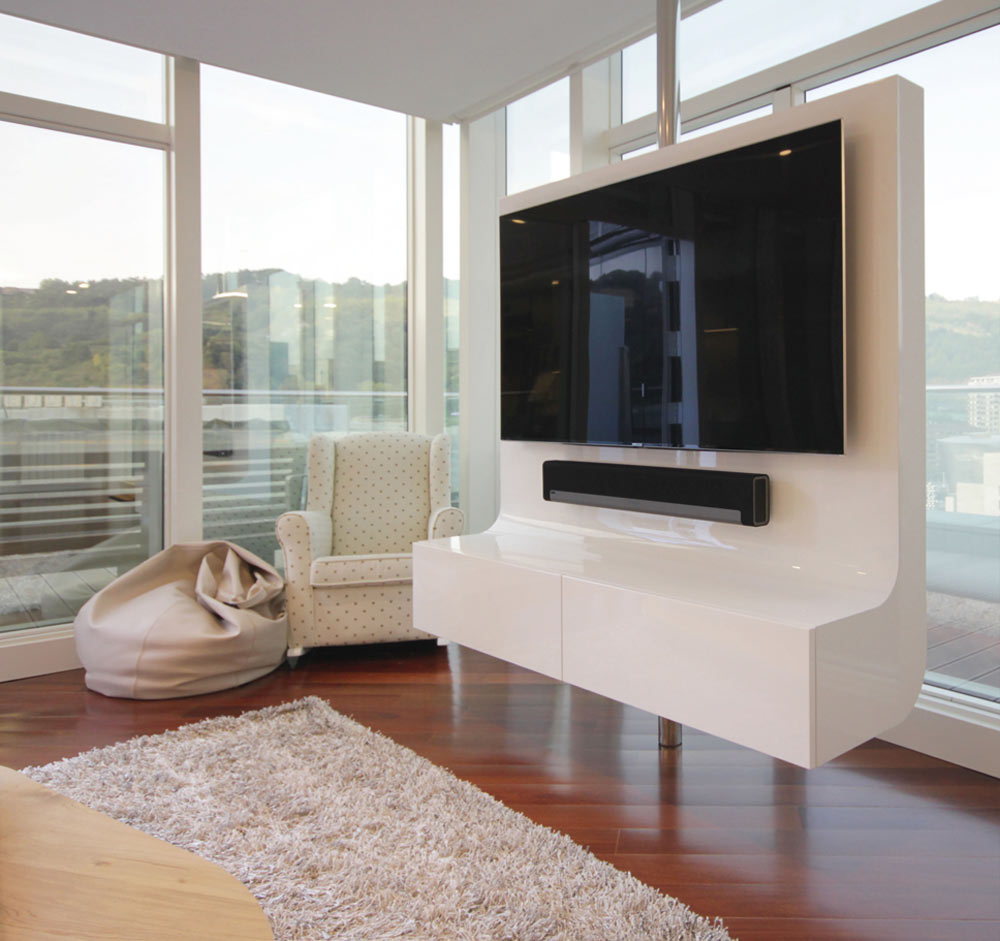 Mueble de tv a medida en laca brillo con sistema giratorio 360º que permite cambiar su orientación.