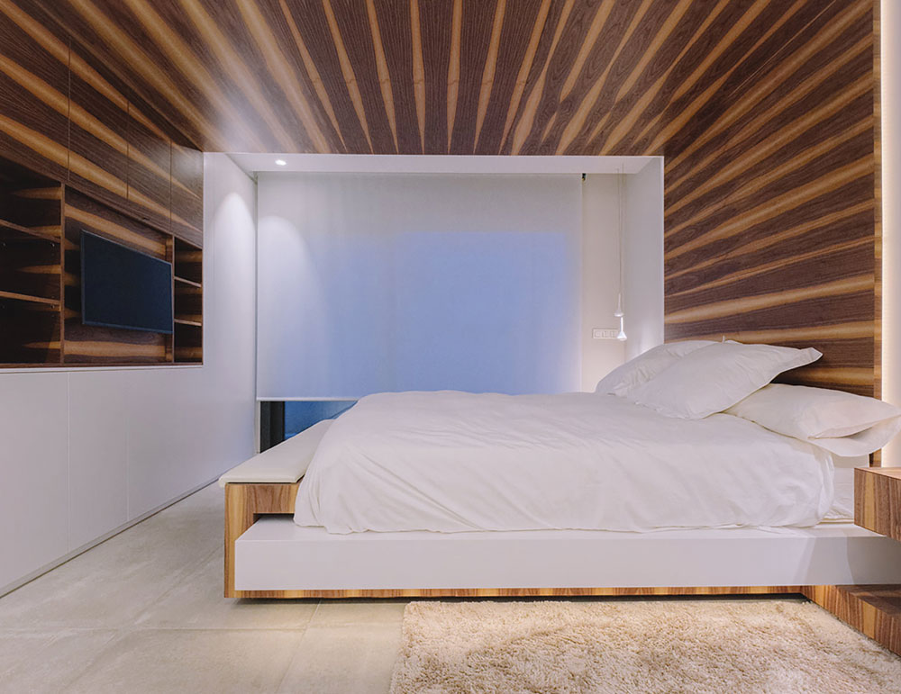 Dormitorio con paredes y techos panelados con madera natural veteada, pared con tv y estanterías integradas. Estructura de cama a medida con mesillas y banco tapizado integrados, acabado en madera veteada combinada con lacado en color blanco.
