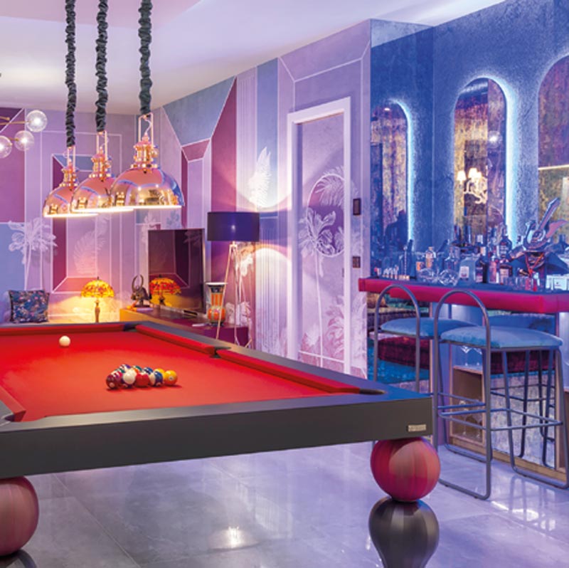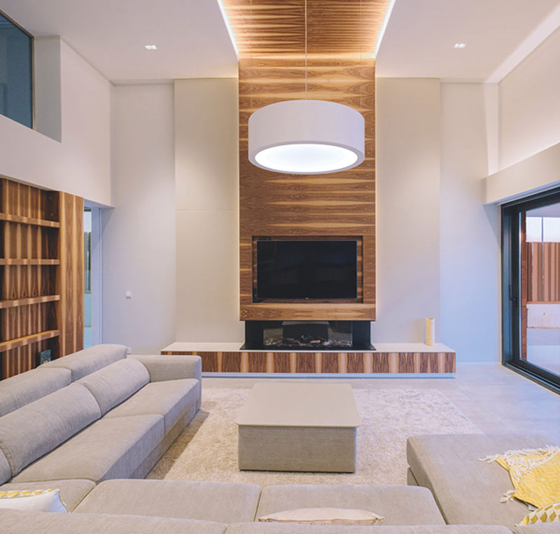 Mobiliario a medida y panelados en paredes y techos.