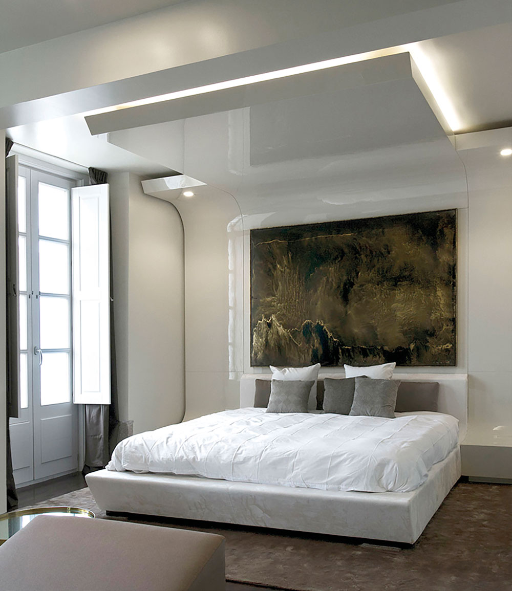 Dormitorio con estructura de cama a medida en laca brillo con led inferior. Estantería con formas redondeadas y led integrado.