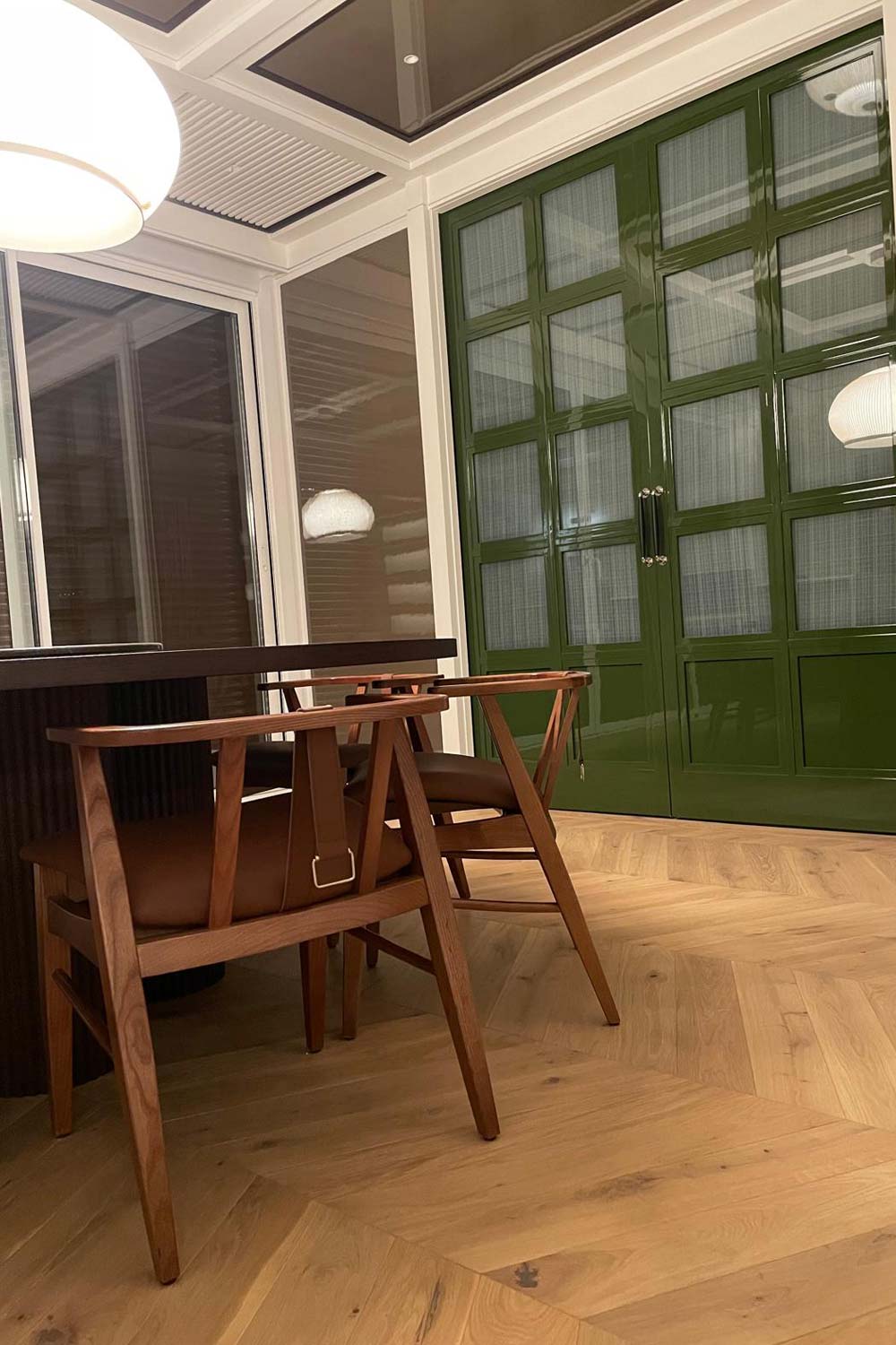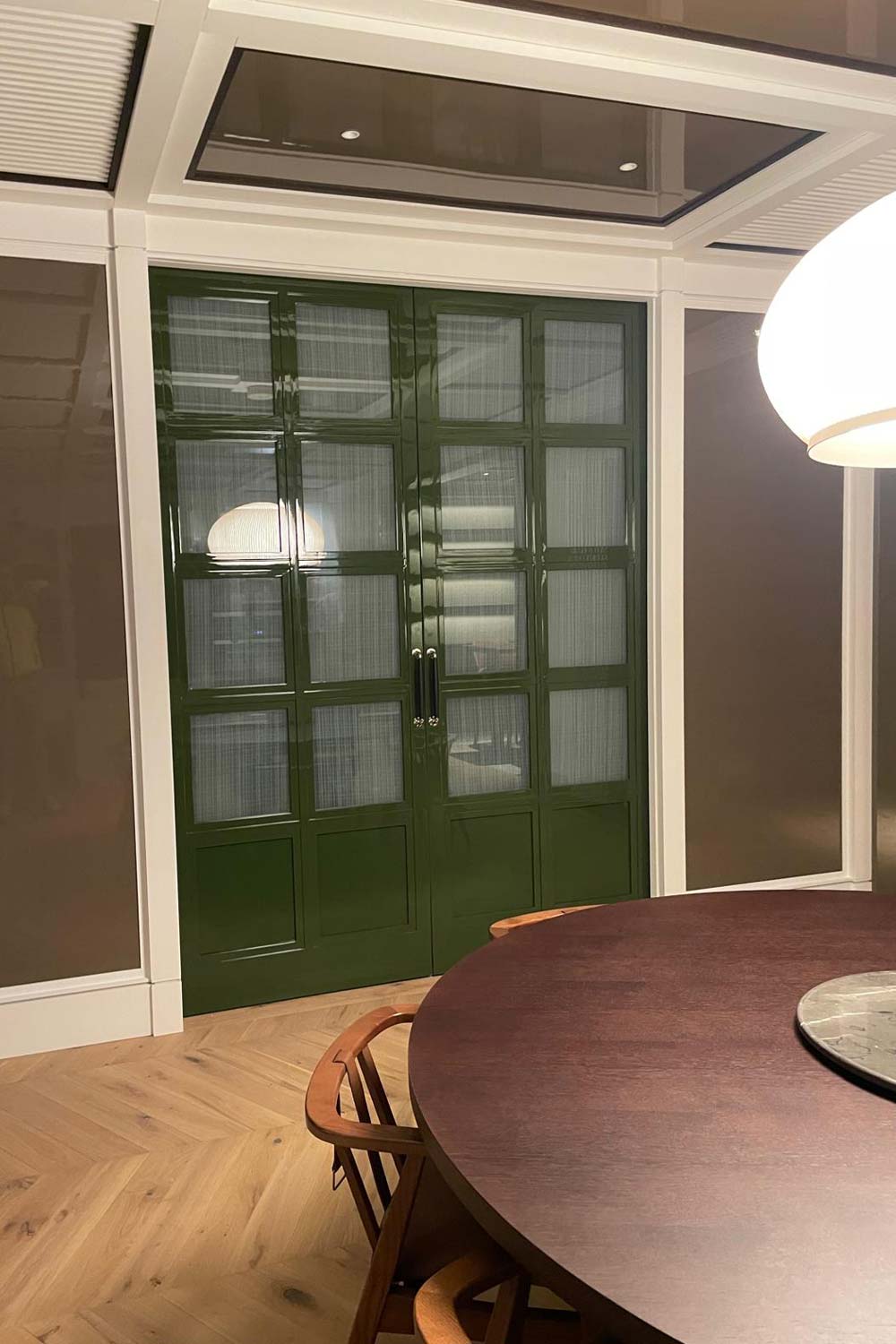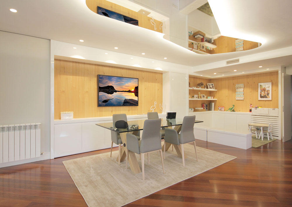 Comedor con muebles a medida, panelados en pared laca brillo y madera natural. Zona infantil con muebles a medida.