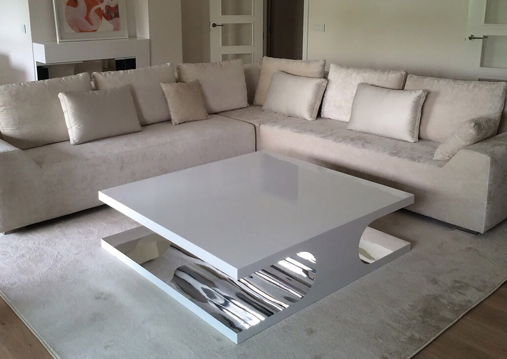 Desarrollo de mesas de centro a medida con exterior en laca brillo e interior en forma curvada y lámina de micras metálicas efecto espejo.