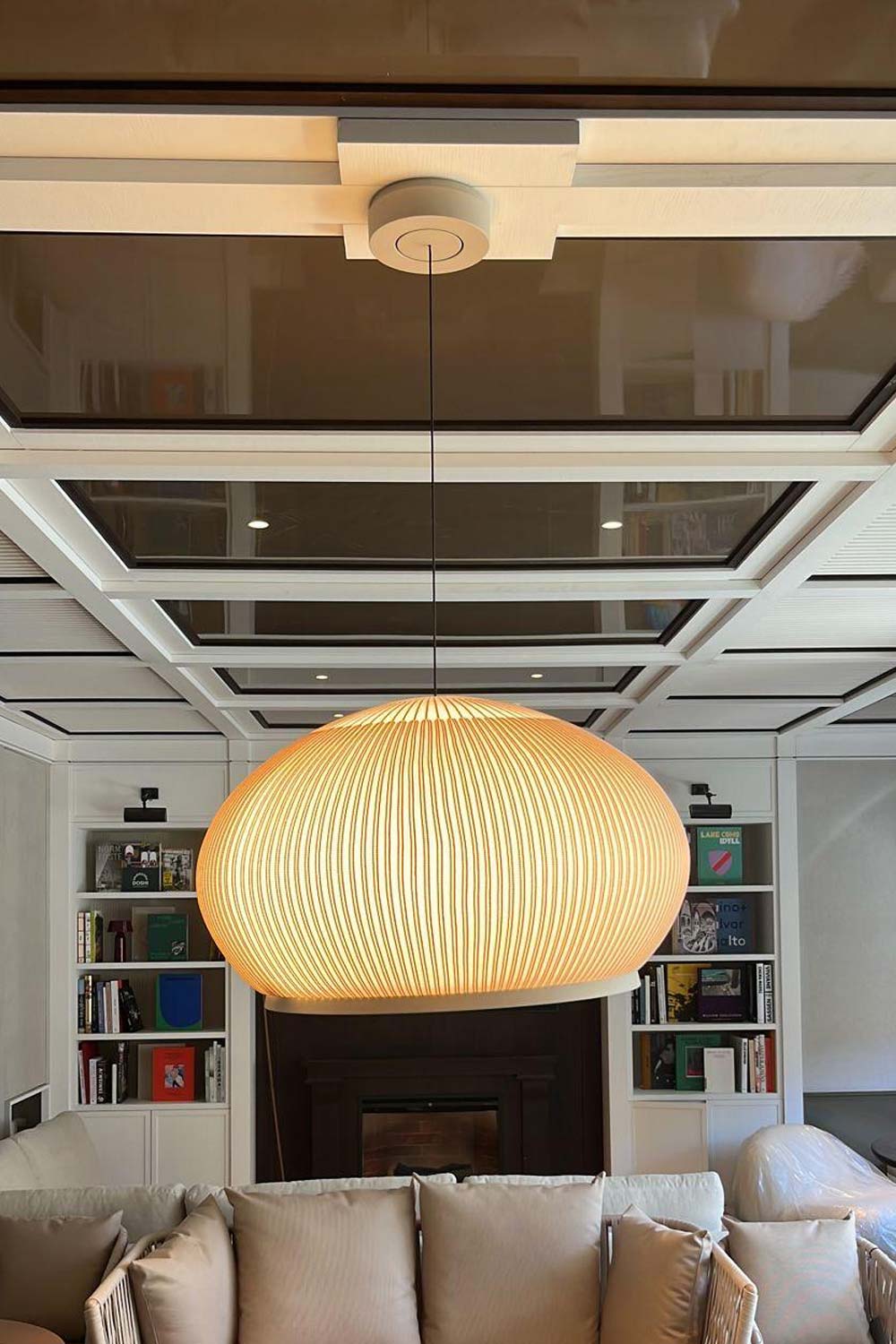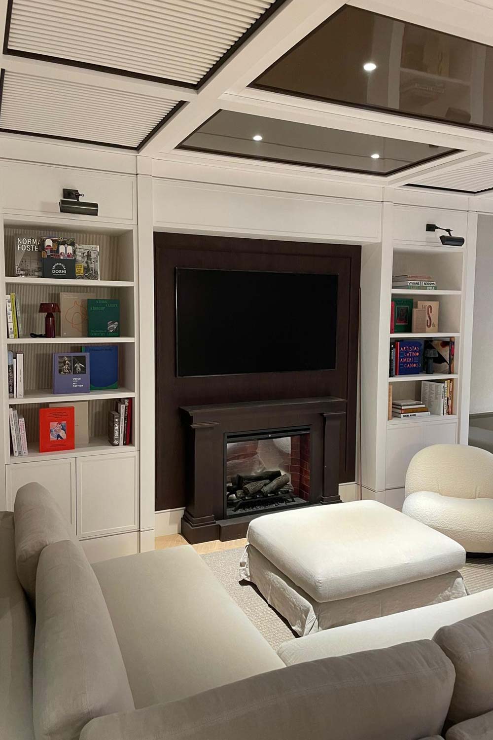 Desarrollo de mobiliario para interior realizado a medida y revestimientos en paredes y techo. Puerta corredera y librería con lacado de color alto brillo. Mesa con taburetes y mesa de comedor redonda y librería con chimenea.