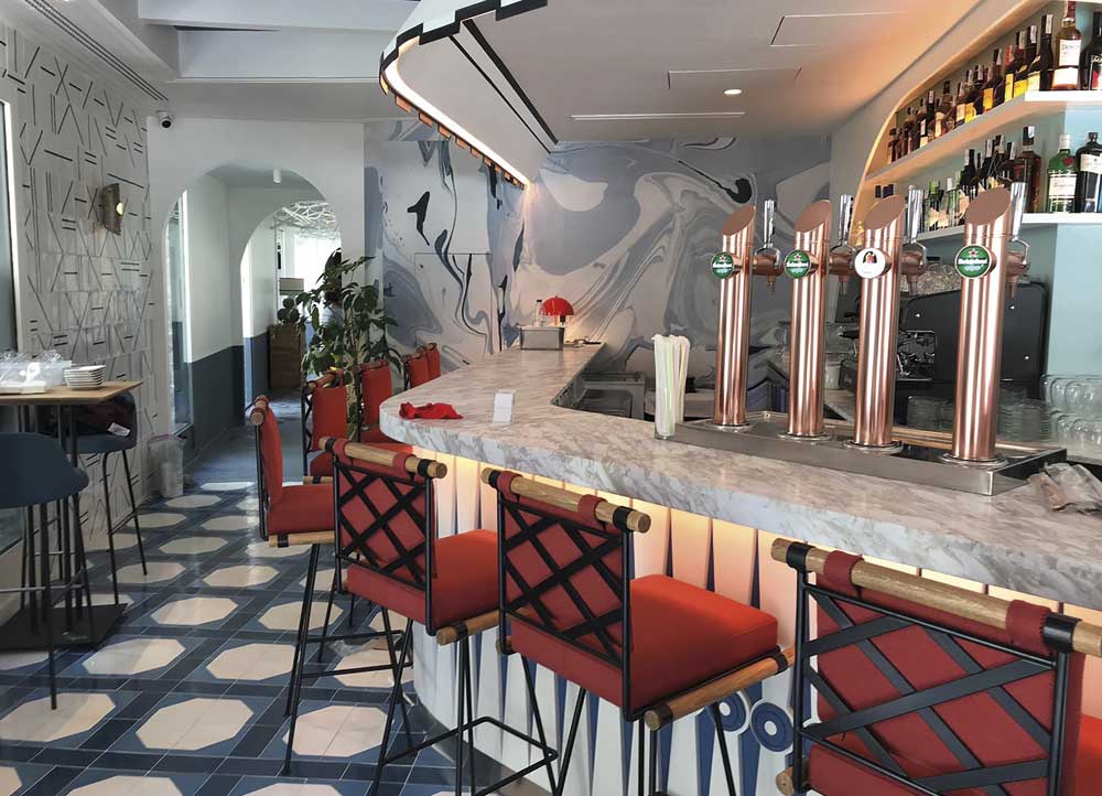 Restaurante a medida con barra en mármol con friso decorado en madera de varios colores y taburetes de metal, madera y tapizado.